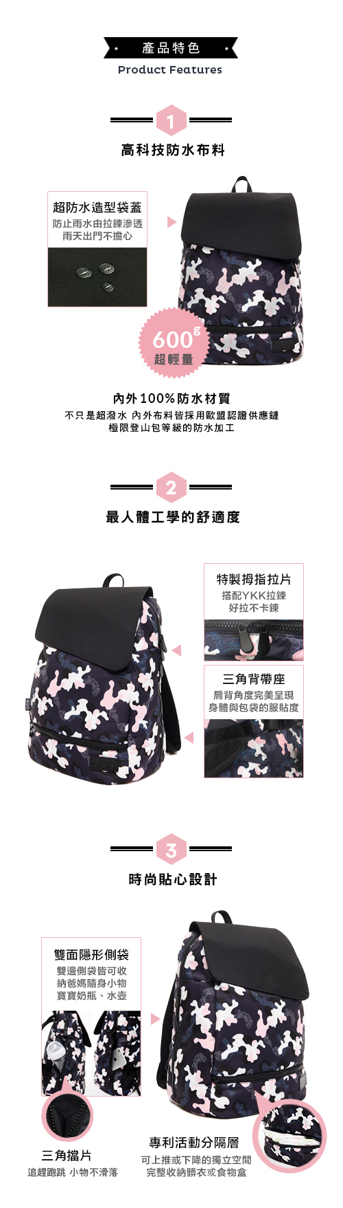 寶寶滿歲前,爸爸媽媽出門要備的用品實在不少。分層歸納,讓爸媽能輕易找到所需用品,包身不見奶瓶、水瓶、內建筆電防震夾層,讓爸爸媽媽能兼顧育兒與工作,帥氣、時尚的遊走於各個聚會與場合。