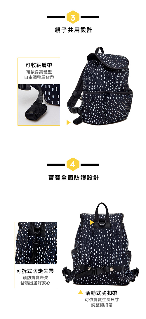 背包袋蓋採貼心的磁扣設計,內袋採彈性束口設計,讓寶寶的稚齡小手輕鬆收取物件。貼心附贈可拆式防走失帶,一家出遊好安全。