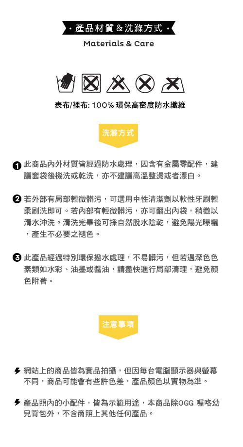 ① 迷你都會包內外材質皆經過防水防污處理,不易臟汙。不建議機洗或乾洗,亦不建議高溫整燙或者漂白。